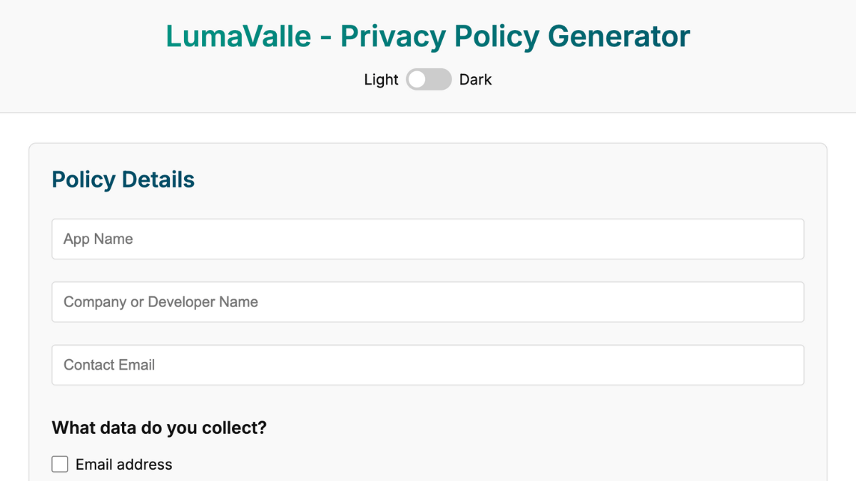 Need a professional privacy policy for your website or app? The Lumavalle Privacy Policy Generator makes it simple, fast, and secure – no signups, no subscriptions, and no data tracking.